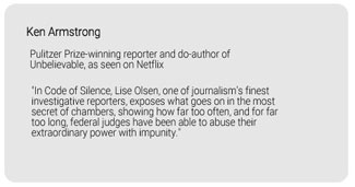 "Lise Olsen is a masterful investigative reporter and storyteller. She was the first to uncover the full story of Judge Samuel Bristow Kent and the victims he harmed. Her book goes right to the heart of judicial corruption - and the complaint system that protects federal judges. Harrowing and redemptive."